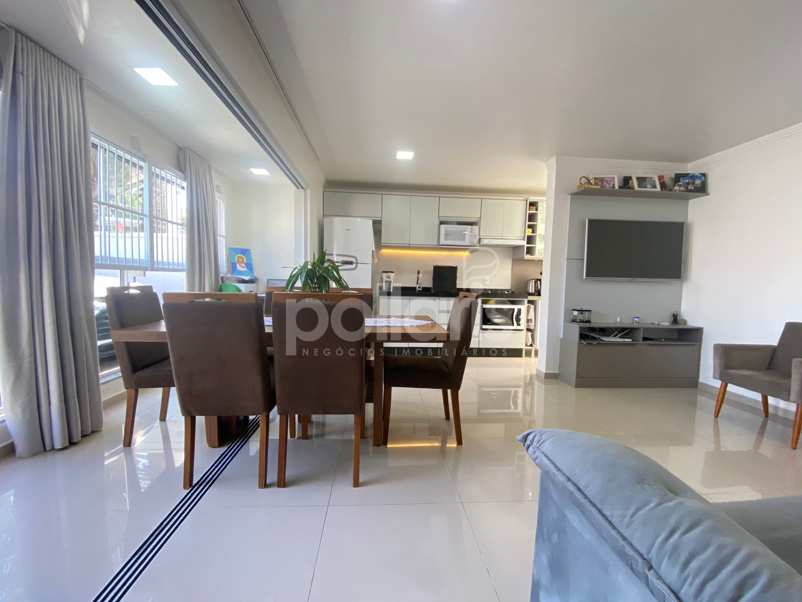 São 2 dormitórios, sendo 1 suíte, e uma varanda integrada com churrasqueira pra curtir o fim de tarde com aquele cheirinho de mar.