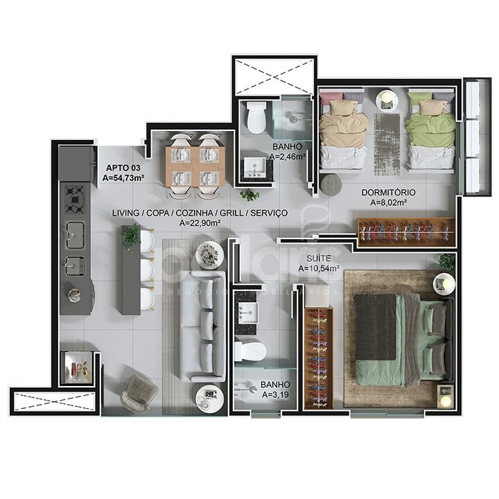 2 Dormitórios, sendo 1 suíteGaragens